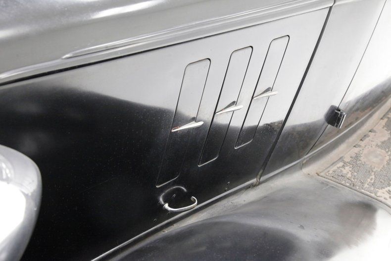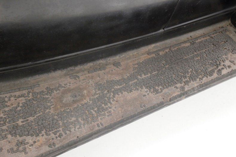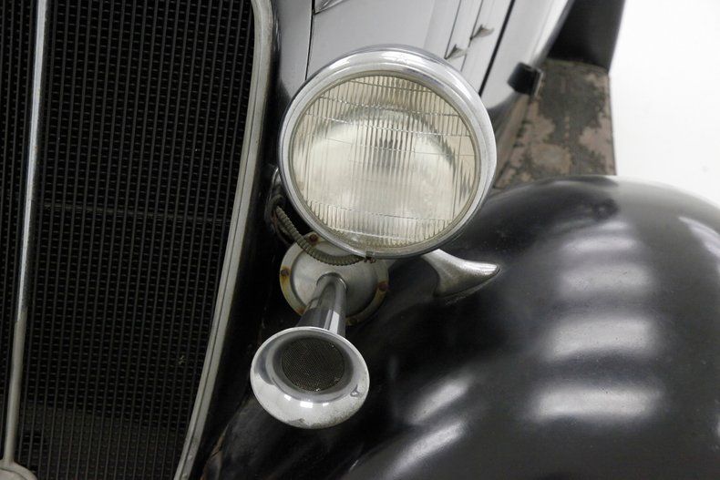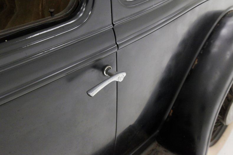 Leading the way is the egg crate filled and chrome corral grilleup front and the single chrome bezel and cased headlight on either side to light your way. The horn hangs below the driver's headlight and moving downward gives us a view of the simple curved chrome bumper to frame the lower of the car's curvaceous front fenders, which are bathed black. A nice long cowled hood has some accenting horizontal ribs on either side vents, and it hooks up with the passenger compartment at the firewall. More black bathes this body and overall some light fading of the finish, lacquer cracks and an overall patina that comes from age. The central panel of the roof is heavily aged vinyl in black, as the technology of the day did not have the machining capabilities to press a full steel roof. The rounded cabin melts into the curved downward trunk line and frames the single doors and snazzy D shaped rear B pillar glass is seen behind the back of the main crank down window. The glass remains all original with the exception of the right corner glass which is easily notable due to a differing tint. Below the single doors is a running board in black and covered with rubber that is aged, cracked and missing in areas. This board gently curves into the rear fender which undulates with the rear of the car. The back of the car melts into a black painted rear roll pan, and has an exterior mounted spare tire in the back of a curve to match the tire space, rear bumper. 18-inch black wire wheels are wrapped with heavily dry rotted white wall rubber, and a central chrome moon cap is on all wheels including the spare in back.
