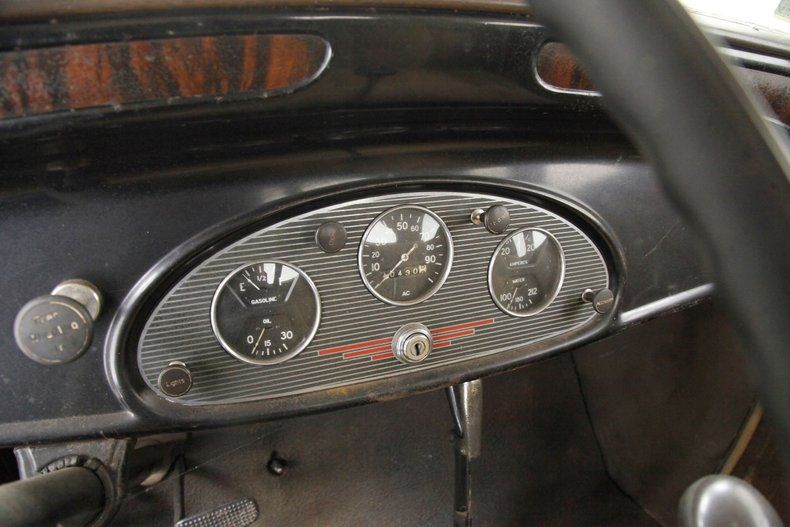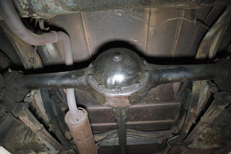 Worn and quite possibly the original tan mohair broadcloth covers all the interior, including the door panels and the buttoned and wide tuck and roll paneled overstuffed interior bench. Black rubber matting provides the sea of flooring for the beach to float on. There is moth damage, light tearing and general wear seen on the bench. A nice big round black steering wheel is fronting the all black painted steel dash front. Within this dash are dual crescent shaped wood veneer panels and dash central holds the factory instrument cluster within a ribbed and chromed panel. A long shifter and handbrake are on the floor in the center just in front of the bench. A shout to the trunk which is rust free and fairly clean in all steel configuration. Plenty of room for the Tommy guns and hooch!