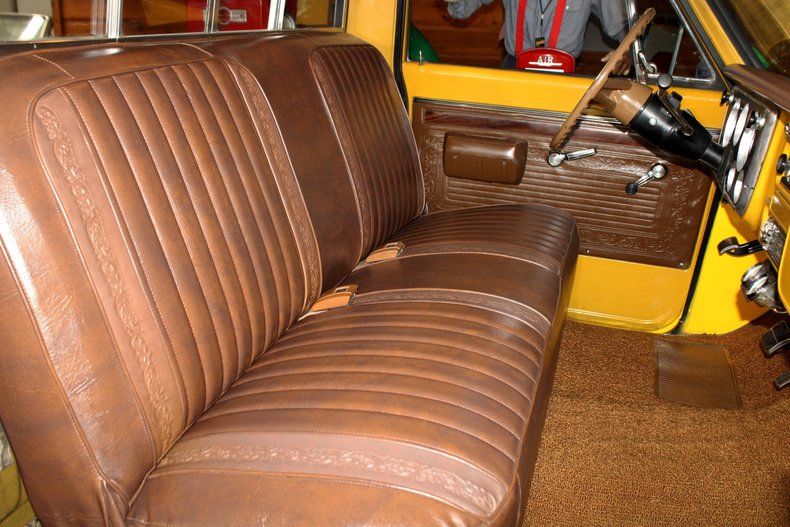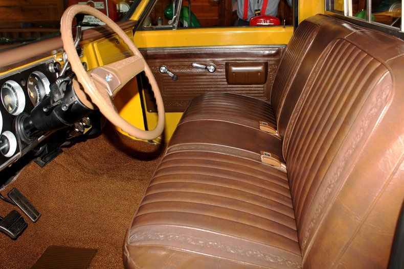 350 cui Chevrolet Small Block V8 engine (casting# 3970010). Automatic TH400 transmission with column shift. 10 bolt rear end. Painted Two-tone Yellow / White exterior. Brown Deluxe bench seat interior. Power front disc brakes. Power steering. Air Conditioning. Single exhaust with manifolds. Front sway bar. Quadra-Jet 4 barrel carburetor. Factory gauge cluster with Bosch under-dash gauges. Tilt column. Lap belts. Rear sliding window. Delco radio (non-op). Tow mirrors. Wood-bed with painted railings. Trailer hitch. Factory Painted 8 lug wheels with Tacoma Trail A/T tires.